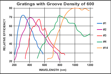 圖1、相同刻痕密度的光柵具有不同閃耀波長(zhǎng)及其衍射效率