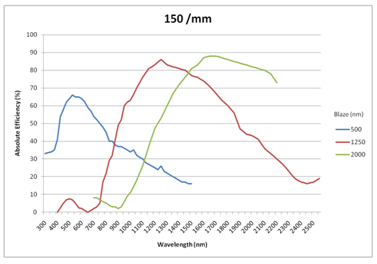作為光柵衍射入射光多色光,它不具有均勻效率這樣做。 衍射曲線的整體形狀主要取決于凹槽面角,否則稱為閃耀角。利用這一性質(zhì),可以計算出該閃耀角將對應(yīng)于該峰值效率; 這就是所謂的閃耀波長。 這個概念如圖2-1所示,其中比較了三種不同的150克/ mm的光柵閃耀在500nm,1250nm和2000nm的。