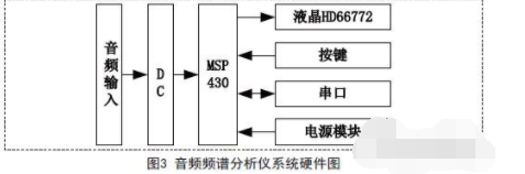 為了達(dá)到系統(tǒng)功能,采用16bit處理器MSP430來高效處理輸入的數(shù)據(jù)流。MSP430自帶ADC12模塊,ADC12的采樣數(shù)據(jù)經(jīng)過運(yùn)算,通過65K色的液晶顯示頻譜圖。本系統(tǒng)硬件系統(tǒng)圖如圖3所示。