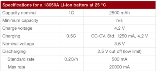 做為恒流測試示例,我們使用鋰離子18650電池。以毫安為單位的容量(C)用于計算充電和放電電流。充電時,電流限制為0.5C(在我們的示例中為1250mA),需要在電池電壓達(dá)到4.2V之前停止充電。參見表1。