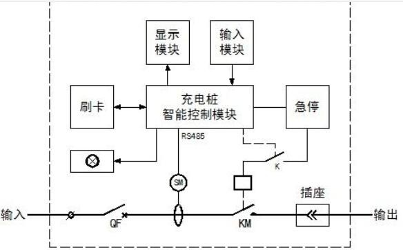 交流充電樁電氣系統(tǒng)如圖2所示,主回路由輸入保護(hù)斷路器、交流智能電能表、交流控制接觸器和充電接口連接器組成;二次回路由控制繼電器、急停按鈕、運(yùn)行狀態(tài)指示燈、充電樁智能控制器和人機(jī)交互設(shè)備(顯示、輸入、刷卡)組成。