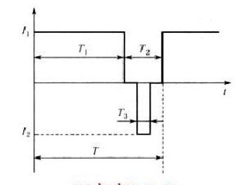 最新型的直流充電樁采用快速充電法,該系統(tǒng)區(qū)別于傳統(tǒng)充電器所采用的連續(xù)電流充電和脈沖電流充電方式,采用了智能化的變脈沖充電方式,即采用如下圖4所示的充電電流脈沖,包括充電脈沖T1間歇脈沖T2以及放電脈沖T3。通過間歇停充,使蓄電池經(jīng)化學(xué)反應(yīng)產(chǎn)生的氧氣和氫氣有時(shí)間重新化合而被吸收掉,使下一輪的恒流充電能夠更加順利地進(jìn)行,使蓄電池可以吸收更多的電量。