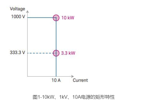 如果PMAX等于VRATED乘以IRATED,這將使其成為30kW電源,但它的額定功率為10kW。該電源能夠輸出從1000V、10A到333.3V、30A的等于10kW的任何電壓或電流組合。自動量程電源非常靈活,因為無需擔(dān)心有多個電源來覆蓋不同的電壓和相同功率水平的電流組合。