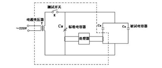 該電容電橋測試儀采用橋式電路結(jié)構(gòu),標準電容器和被試電容器作為橋式電路的兩臂。當進行電容器電容值測量時,測試電壓同時施加在標準電容器和被試電容器上,處理器通過傳感器同采集流過兩者的電流信號并進行處理后得也被試電容器的電容值。