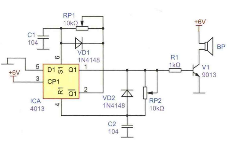 當(dāng)C1端電壓上升到置位電平時(shí),觸發(fā)器翻轉(zhuǎn),Q1變?yōu)楦唠娖?,Q1非變?yōu)榈碗娖?,Q1端的高電平向C2充電,C1通過二極管VD1向變?yōu)榈碗娖降腝1非端放電,如此不斷循環(huán),在Q1和Q1非端交替出現(xiàn)高、低電平,形成振蕩。因而該電路是一個(gè)無穩(wěn)態(tài)的振蕩器。Q1端的振蕩信號(hào)通過電阻R1加到三極管V1的基極,經(jīng)過V1放大后推動(dòng)揚(yáng)聲器BP發(fā)出響亮的音頻聲。