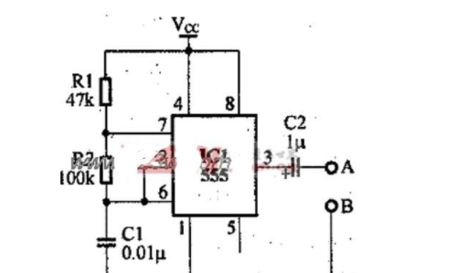 當(dāng)電源接通后555就開始音頻振蕩,通過C2電容器耦合輸出。其振蕩過程是:首先通過R1、R2使C1充電,當(dāng)C1上電壓達(dá)到約2/3VCC,時(shí),555輸出端3腳由高電平變?yōu)榈碗娖健?腳與1腳之間導(dǎo)通,接著C1通過R2放電,C1上電壓下降到約1/Vcc,時(shí),555的7腳與1腳之間截止,3腳輸出變成高電平。如上所述,C1重復(fù)進(jìn)行充電一放電,就形成音頻振蕩。輸出振蕩信號(hào)高電平接近Vcc,低電平接近0V。振蕩頻率約為:f=1.44/(R1+2R2)C1按圖中元器件值,振蕩頻率約580Hz。