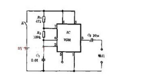 電路如下圖所示。開關(guān)K閉合接通電源后,7555就按音頻重復(fù)振蕩,通過10μF電容器耦合輸出。振蕩過程是:首先通過R1和R2使C1充電,當(dāng)C1上電壓達(dá)到約2V時(shí),7555輸出端3腳由高電平變?yōu)榈碗娖?,?腳與第1腳之間導(dǎo)通。接著C1通過R2放電,C1上電壓下降到約1V時(shí),7555第7腳與第1腳之間截止,第3腳輸出變成高電平。如上所示,C1重復(fù)進(jìn)行充電-放電,就形成了音頻振蕩。輸出振蕩信號(hào)高電平接近3V,低電平接近0V,最后輸出峰峰值達(dá)3V的方波。