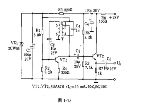 本振蕩器是通訊機(jī)用戶服務(wù)信號(hào)源。工作原理如圖1-13所示。它由VT1.VT2等相關(guān)元器件組成,VT1利用變壓器T耦合產(chǎn)生振蕩信號(hào),VT2為共集電極電路起緩沖放大,射極輸出。T變量器1-4繞組和C4電容組成選頻網(wǎng)絡(luò)。為避免T磁飽和,T由1-2抽頭接至VT1的集電極,T的5-6是反饋線圈。