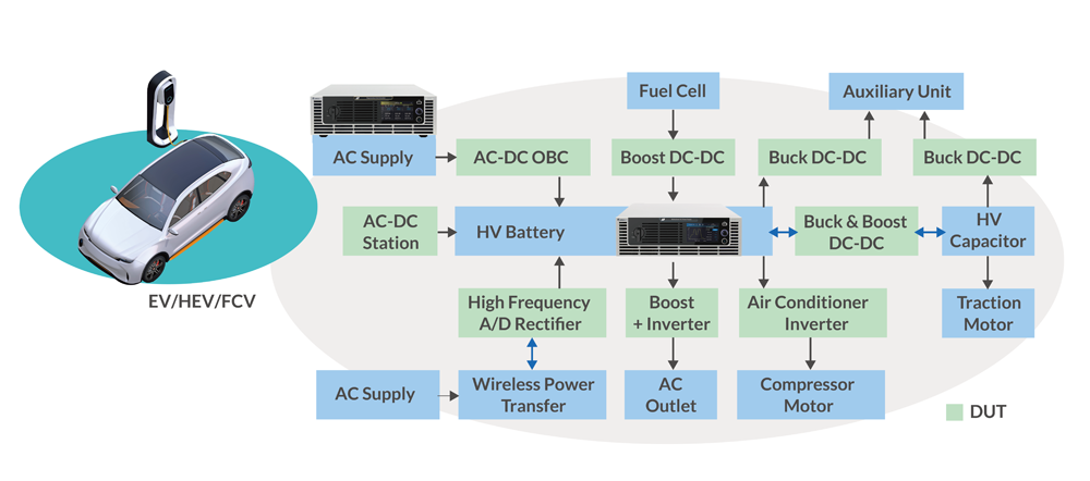 電動(dòng)車的電力核心為高壓的動(dòng)力電池,交流充電樁經(jīng)BOBC轉(zhuǎn)換成直流對(duì)高壓動(dòng)力電池包充電,而電池經(jīng)電源配置單元PDU將電力做全車的安全配置,如高壓動(dòng)力電池經(jīng)DC-DC轉(zhuǎn)換供應(yīng)低壓電池及車載裝置,亦或?qū)⒏邏褐绷鹘?jīng)逆變器驅(qū)動(dòng)交流動(dòng)力馬達(dá)等,以及除車內(nèi)供應(yīng)外,電力再經(jīng)BOBC轉(zhuǎn)換成交流對(duì)外部電子產(chǎn)品供電(V2L)。在以上所擴(kuò)及到的車上電源轉(zhuǎn)換零件皆從動(dòng)力電池出發(fā),然而此些電源轉(zhuǎn)換裝置的開發(fā)及測(cè)試過程,則需要可以模擬電池充放電的雙向直流電源作測(cè)試,Chroma 62000D雙向直流電源即是取代電池包,具有良好的特性及效益滿足車上電源轉(zhuǎn)換裝置的開發(fā)及測(cè)試。