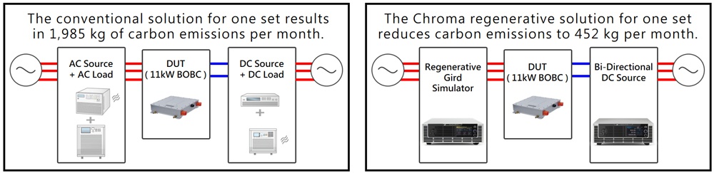 致茂電子持續(xù)推出新能源回收測(cè)試解決方案,運(yùn)用新的電網(wǎng)模擬器61800及雙向直流電源62000D兩臺(tái)設(shè)備可達(dá)傳統(tǒng)四臺(tái)設(shè)備之功能,在測(cè)試過程中將待測(cè)物輸出能量回饋到電網(wǎng)直接循環(huán)利用,降低設(shè)備成本、節(jié)省設(shè)備體積、更重要的是達(dá)到節(jié)能減碳目的,以下案例為11kW雙向車載充電器測(cè)試碳排放比較,使用Chroma能源回收式方案每月可減少1,533公斤碳排放,2022年,致茂已協(xié)助國際電動(dòng)車廠家及ODM廠商導(dǎo)入此方案并減少碳排放3,496公噸(等同為地球種了249,660顆杉樹)。