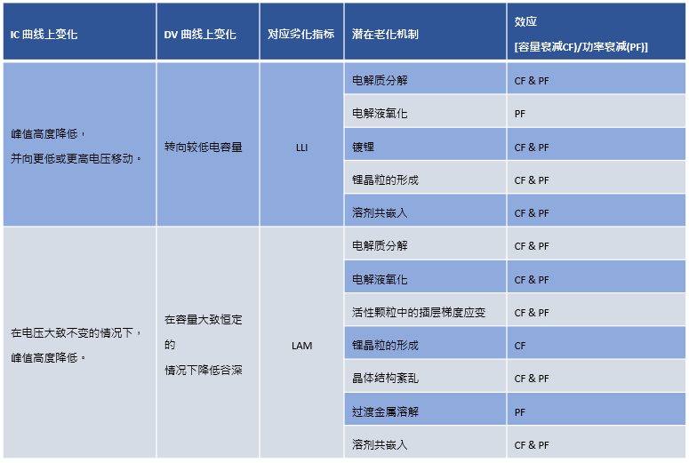 ▲表一、IC-DV 曲線的變化與對(duì)應(yīng)的劣化指標(biāo)、潛在的老化機(jī)制和相關(guān)的效應(yīng)之間的關(guān)系