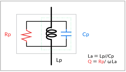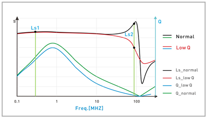 | ▲ 圖一、 電感在高頻的等效電路與Ls與Q的關(guān)系式 | ▲ 圖二、 取樣品實(shí)測兩個(gè)曲線說明 |