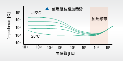 由于電解質(zhì)在零下溫度離子導(dǎo)電度降低,使鋰離子電池芯內(nèi)阻上升而降低正常的能量及功率輸出/入能力,交流加熱技術(shù)運(yùn)用適當(dāng)頻率的交流電流通過內(nèi)阻使其產(chǎn)生熱量,功率主要由電阻成分及交流電流有效值決定。影響電解液加熱效率的是使用的交流訊號(hào)振幅與頻率,相關(guān)研究指出高頻(~1kHz)訊號(hào)能產(chǎn)生更好的加熱效率且避免衍生電池劣化。
