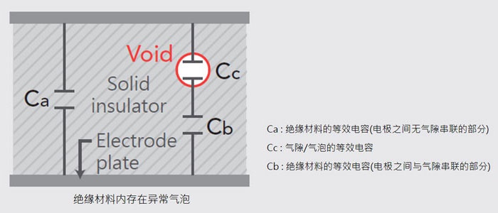 當絕緣體內(nèi)存在氣泡(Void)或絕緣體間存在氣隙(Air gap)時,在正常工作電壓下氣泡或氣隙容易發(fā)生局部放電(Partial Discharge,PD),導致絕緣劣化造成絕緣質(zhì)量異常,例如:樹酯內(nèi)有氣泡或漆包線間的氣隙,因為空氣的介電系數(shù)較低,氣泡或氣隙的電容量比原絕緣材料低,所以會分到相對高比例的電壓,且在相同間隙距離條件下,氣泡或氣隙的崩潰電壓比絕緣材料的低。此類放電發(fā)生于氣泡或氣隙等局部瑕疵, 但與其串行之絕緣材仍維持正常的放電現(xiàn)象稱之為局部放電。