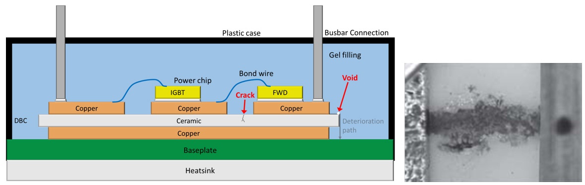 功率組件中的IGBT與SiC-MOSFET被應(yīng)用于各種領(lǐng)域(譬如:電子產(chǎn)品、工業(yè)設(shè)備、航空航天、軍用設(shè)備、鐵路設(shè)備、新能源、智慧電網(wǎng)、新能源車等),且經(jīng)常被使用于高功率/大電流的電源轉(zhuǎn)換/控制線路,工作電壓通常都是數(shù)千伏特,由于會被切換ON/OFF狀態(tài)的關(guān)系,模塊中的閘極(Gate)與集極(Collector)或汲極(Drain)之間,以及模塊與散熱板之間會出現(xiàn)PWM的高電壓差。當高電壓跨越在含有氣泡、氣隙或裂縫的絕緣材料時,就有較大的可能性會發(fā)生局部放電,經(jīng)過長時間的工作后會慢慢使絕緣材料逐漸劣化,進而造成絕緣材料的絕緣失效導致產(chǎn)品損壞。另外,每個模塊的閘極(Gate)與射極(Emitter)或源極(Source)之間工作偏壓可能是由各別的變壓器所提供,而變壓器的一二次側(cè)之間也會存在高頻的高電壓差。當變壓器一二次側(cè)的絕緣能力不足,持續(xù)性異常放電的突波也可能會使數(shù)字控制動作異常及導致晶體管故障。