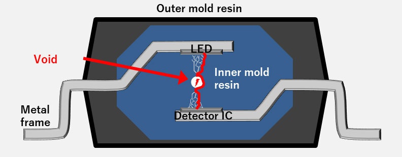 光耦合器與數(shù)字隔離器被應(yīng)用于各種需要隔離的環(huán)境,當隔離的高電壓跨越在含有氣泡或裂縫的絕緣材料時,就可能會有足夠高的分壓在氣泡或裂縫上導致發(fā)生局部放電。 經(jīng)過長時間的劣化后,因絕緣材料的絕緣失效而導致電壓的隔離失效(如圖五)。