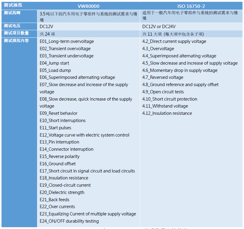 下方表格比較了VW80000與ISO 16750-2規(guī)范之間的波形差異,基本的電力測(cè)項(xiàng)波形上的定義已有明顯的不同點(diǎn),對(duì)于待測(cè)物的電力規(guī)格與環(huán)境溫度要求,更是影響了兩者對(duì)于細(xì)部電力參數(shù)的設(shè)定,前者僅制定了4種測(cè)試情境,而后者則多達(dá)8種,會(huì)有這種差異起因于車廠內(nèi)需求的偏向,而ISO則多了一層作為標(biāo)竿的成分。若使用者要同時(shí)執(zhí)行兩者測(cè)試,常因定義不同需要重新撰寫測(cè)項(xiàng)或手動(dòng)更換硬件,提升了人力花費(fèi)與設(shè)備間的學(xué)習(xí)成本。