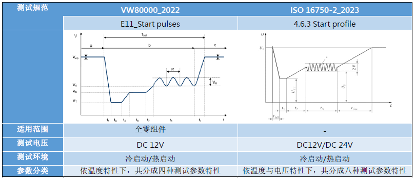 LV124的測(cè)試范圍涵蓋了電力、環(huán)境、機(jī)械、氣候和循環(huán)壽命等項(xiàng)目,以常見(jiàn)的VW80000和ISO16750-2規(guī)范,二者間雖有一些相似的測(cè)試項(xiàng)目,但測(cè)試內(nèi)容、架構(gòu)和參數(shù)卻存在著根本的差異。以常見(jiàn)的啟動(dòng)特性電力測(cè)試,目的是驗(yàn)證ECU低壓輔電切換電源時(shí)驗(yàn)證是否會(huì)造成ECU失效,測(cè)試架構(gòu)的部分除了一般電力單機(jī)的選擇外,通常還需要整合示波器、溫箱等以輔助測(cè)試。然而大多LV124測(cè)試中皆包含此測(cè)項(xiàng),如:VW80000為E11項(xiàng),而ISO 16750-2則記載于4.6.3章節(jié)中。