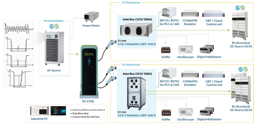 - 保持可擴(kuò)充的測(cè)試系統(tǒng)配置 : 具備高度彈性與客制化能力,可依據(jù)電動(dòng)車或充電樁產(chǎn)品具體的測(cè)試需求與規(guī)格,打造專屬的測(cè)試系統(tǒng)。
