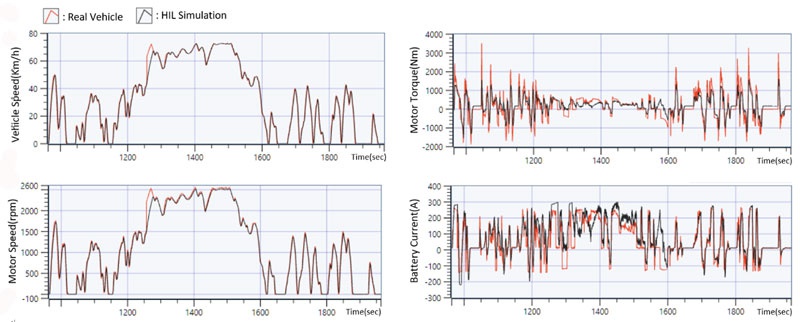 下圖包含車速、電機(jī)轉(zhuǎn)速轉(zhuǎn)矩與電池電流的測試結(jié)果,顯示Chroma Power HIL設(shè)備仿真的電池充放電和驅(qū)動馬達(dá)輸出相關(guān)數(shù)據(jù)與創(chuàng)奕實(shí)車運(yùn)行數(shù)據(jù)高度匹配,進(jìn)而驗(yàn)證此測試方法的精確性和可行性,整體成果不僅證實(shí)Chroma設(shè)備和Altair模型的可靠性,也為整車開發(fā)提供數(shù)據(jù)支持,有效幫助后續(xù)電池壽命與性能之提升。