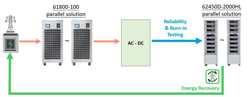 針對Sidecar HVDC架構下AC-DC模塊的系統(tǒng)信賴性測試(Reliability Test)與崩應測試(Burn-in Test)等長時間操作需求,62450D-2000HL內建的能源回收式負載功能可將測試過程中產生的能量有效回饋至電網,于額定操作下回收效率高達94%,協(xié)助節(jié)能減碳、降低電費支出,并減少冷卻系統(tǒng)負擔。