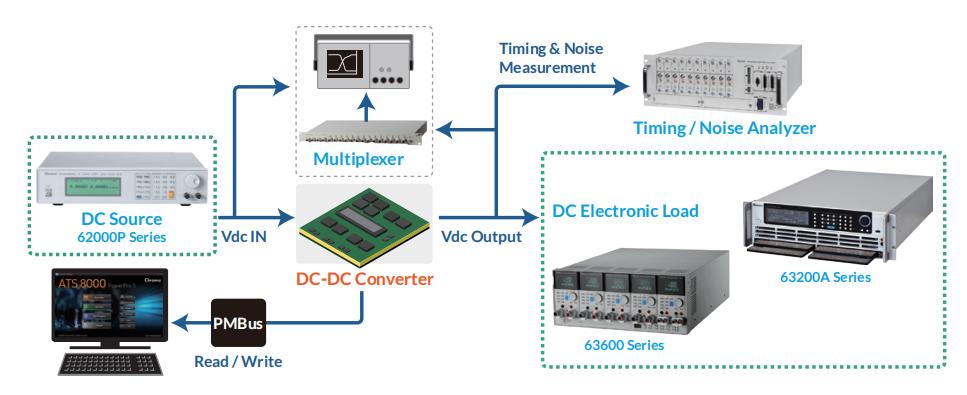 服務器內(nèi)部的直流(DC-DC)轉換器能將輸入電壓范圍40V至60V轉換為12V,每個轉換器功率可達數(shù)千瓦,電流達上百安培。不僅需輸出穩(wěn)定的電壓,轉換效率需達到98%以上。部分元件如內(nèi)存、CPU處理器、集成電路(ASIC)等使用低于12V的電壓,同樣需要DC-DC轉換器進行調(diào)整。甚至AI服務器內(nèi)部的GPU使用的Vcore電源模塊需將電壓降至1V以下,同時輸出電流需達到上千安培。Chroma的電源測試方案包含直流電源與高性能電子負載,可滿足各種直流需求。轉換器的規(guī)格。其高精度的測量功能滿足測試效率的要求。此外,還可靈活配置儀器組成Chroma 8000自動化測試系統(tǒng),全面驗證直流轉換器的規(guī)格與性能,也可應用于生產(chǎn)線進行高效測試。