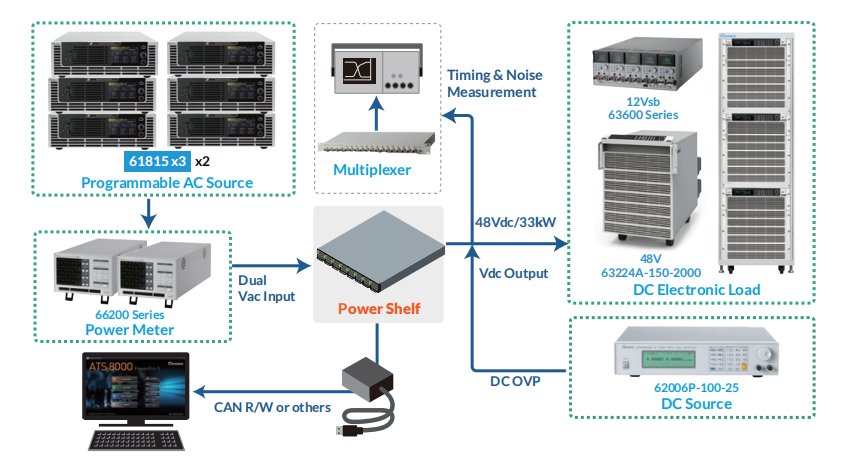 ORV3 (Open Rack Version3) Power Shelf,是專為數(shù)據(jù)中心和大型服務(wù)器架構(gòu)設(shè)計的電源解決方案,目前主流產(chǎn)品可在1OU高度內(nèi)可供應(yīng)高達(dá)33kW的電力輸出,大功率產(chǎn)品可到72kW。Power Shelf 須高性能轉(zhuǎn)換(例如80PLUS 認(rèn)證)以減少能源損耗。并具備冗余機(jī)制與熱插拔功能,確保系統(tǒng)即使在PSU模組更換時仍能穩(wěn)定運行。Chroma針對Power Shelf提供符合OCP ORV3測試指南要求的測試解決方案,能有效驗證在實際應(yīng)用中的性能與可靠度,確保其滿足高標(biāo)準(zhǔn)的運行需求。其測試構(gòu)架與設(shè)備建議如下: