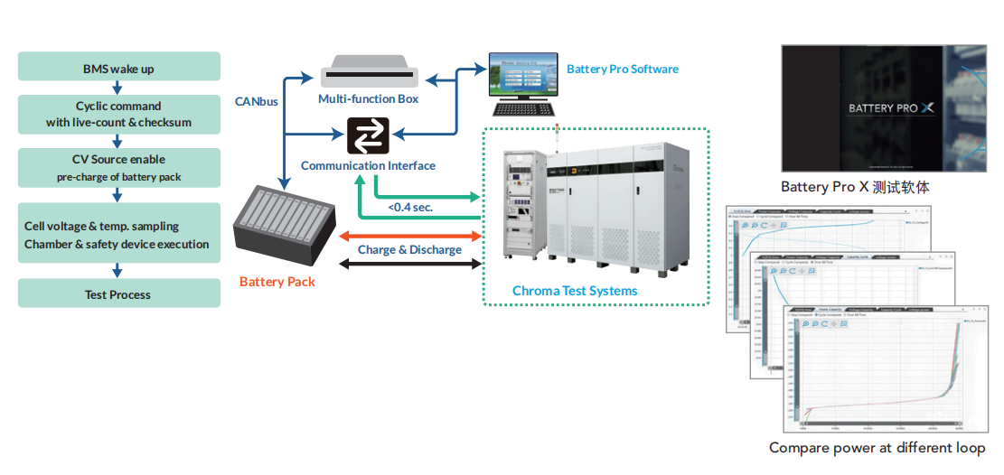 Chroma充放電測(cè)試系統(tǒng)170X0系列可通過(guò)測(cè)試工步設(shè)定模擬電池BMS喚醒,并與BMS通信監(jiān)測(cè)電芯狀態(tài)。同時(shí)可控制充放電以動(dòng)態(tài)調(diào)整充電電流(CC模式)同步驗(yàn)證電池管理系統(tǒng)(BMS)通信狀態(tài),以確保電池組充電功能與效率的最優(yōu)化。并可整合數(shù)據(jù)記錄器與溫控箱等設(shè)備,提升整體測(cè)試靈活性。實(shí)時(shí)監(jiān)控機(jī)制能協(xié)協(xié)助掌握電池測(cè)試狀態(tài)與異常,確保操作安全與數(shù)據(jù)準(zhǔn)確性。通過(guò)模擬BBU實(shí)際負(fù)載和充電行為,輔助驗(yàn)證電池模組效能并優(yōu)化系統(tǒng)設(shè)計(jì)。