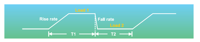 在快速的時代里,電子元件皆朝高速運作的方向設(shè)計,因此,電源元件對于暫態(tài)的信號及動態(tài)響應(yīng)的性能要求,比過去都高出許多。為滿足這些 測試應(yīng)用與要求,63200系列提供高速、可編程動態(tài)負(fù)載模擬與同步動態(tài)負(fù)載等功能。下圖所示為可編程的參數(shù):設(shè)定電流高/低準(zhǔn)位、T1/T2、爬 升率/下降率。可編程的電流爬升率/下降率可用來模擬真實負(fù)載情況的暫態(tài)負(fù)載變化模擬。63200系列中,在負(fù)載電流連續(xù)變化時,內(nèi)部的監(jiān)測機 制與線路能使得電流波形失真度達到小化,電流爬升率快可達25A/μs (63208)、動態(tài)變化可高達20kHz。