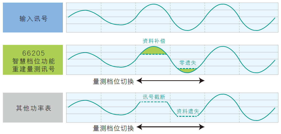 一般的功率表在電壓或電流變化需要換量測(cè)檔位時(shí), 會(huì)有短暫資料遺失的現(xiàn)象。若是采積分模式量功率, 會(huì)產(chǎn)生誤差。 66205特殊設(shè)計(jì)的智慧檔位(Smart Range)功能允許功率積分模式(Power Integration)可以在自動(dòng)檔位條件下進(jìn)行功率量測(cè),量測(cè)動(dòng)態(tài)或不穩(wěn)定的電壓與電流訊號(hào),即便檔位隨著訊號(hào)變化而切換,也不會(huì)讓量測(cè)資料遺失,真正做到無(wú)間隙的波形采樣與量測(cè)。