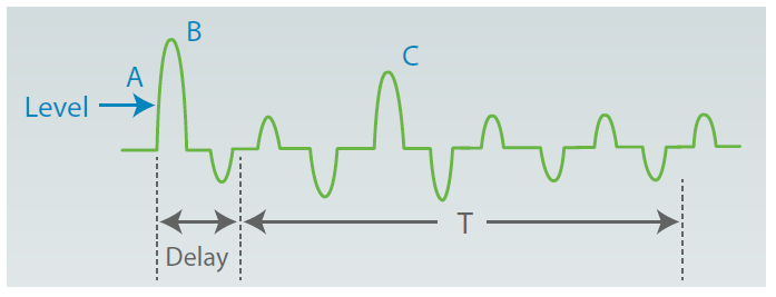 66205功率表提供量測(cè)浪涌電流(Is)的功能,使用者可以設(shè)定一個(gè)電流準(zhǔn)位(A)來(lái)觸發(fā)開(kāi)始量測(cè)電流,或使用后背板的TTL信號(hào)來(lái)進(jìn)行觸發(fā);另外可設(shè)定延遲參數(shù)( Delay),用來(lái)延遲真正擷取電流波形的時(shí)間,可幫助忽略掉剛開(kāi)始不需要的波峰B;時(shí)間參數(shù)T,為實(shí)際擷取波形的時(shí)間長(zhǎng)度。透過(guò)以上設(shè)定機(jī)制,66205數(shù)位功率表可量測(cè)到C點(diǎn)的波峰電流,在實(shí)際應(yīng)用上可以避開(kāi)待測(cè)物輸入端X電容造成的效應(yīng),可偵測(cè)到有緩開(kāi)機(jī)(Soft-start)的真正浪涌電流。 |