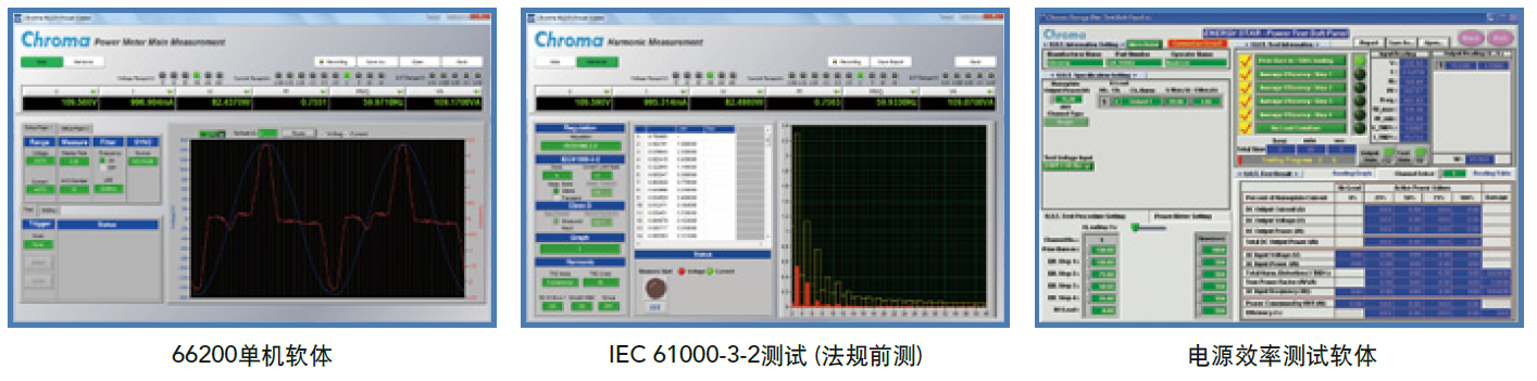 66200系列功率表提供單機(jī)軟體,讓使用者透過(guò)USB、GPIB或LAN介面在電腦上控制及讀取資料,還可觀察電壓電流波形、記錄隨時(shí)間變化的關(guān)系圖,及設(shè)定參數(shù)及時(shí)間,將長(zhǎng)時(shí)間量測(cè)值儲(chǔ)存至檔案后供分析。此軟體也支援IEC 61000-3-2諧波電流限制測(cè)試之法規(guī)前測(cè) (Pre-Compliance),允許使用者確認(rèn)UUT是否符合諧波電流限制值要求。另外電源效率測(cè)試軟件,整合66205功率表、電子負(fù)載及交流電源,可依照節(jié)能規(guī)范簡(jiǎn)單設(shè)定后,即可自動(dòng)按法規(guī)步驟進(jìn)行測(cè)試,并產(chǎn)生報(bào)告,相當(dāng)適用于研發(fā)或品保驗(yàn)證。