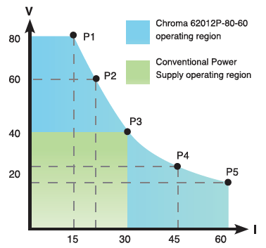 62000P系列直流電源供應(yīng)器提供寬廣的操作范圍。例如,62012P-80-60的輸出規(guī)格為 1200W/80V/60A可于不同的組合中靈活操作如圖右側(cè)所示。如普通的直流電源電源供應(yīng)器顯示提供所有的輸出電壓相同的額定電流,而62000P于低輸出電壓時(shí)提供較大的電流。這表示低電壓/高電流及高電壓/低電流兩者的待測(cè)物可使用單臺(tái)直流電源供應(yīng)器測(cè)試輸入穩(wěn)定度,于一般的ATE系統(tǒng)內(nèi)部避免多臺(tái)直流電源供應(yīng)器以節(jié)省成本與空間。