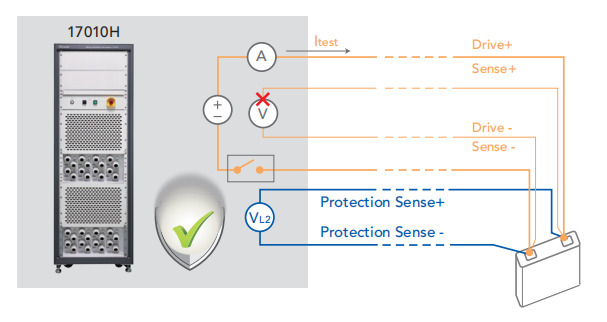 大型電池芯在事故時(shí)引發(fā)的災(zāi)害難以預(yù)期,為強(qiáng)化實(shí)驗(yàn)安全性,在每個(gè)信道獨(dú)立設(shè)置了輔助的電壓保護(hù)測(cè)量回路,獨(dú)立記憶保護(hù)參數(shù)并自主運(yùn)作,異常時(shí)立即強(qiáng)制關(guān)閉輸出回路來(lái)保障實(shí)驗(yàn)安全。