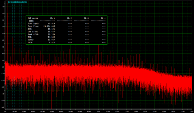 當(dāng)高速ADC進(jìn)行數(shù)據(jù)采集時(shí),由于噪聲和失真的影響,實(shí)際ADC的信噪失真比達(dá)不到其標(biāo)稱位數(shù)應(yīng)達(dá)到的理想性能。一般情況下,示波器帶寬越高,其內(nèi)部噪聲就越高。因?yàn)楦哳l噪聲會(huì)進(jìn)入高帶寬示波器內(nèi)。由于ADC僅為示波器系統(tǒng)的一部分,不能獨(dú)立使用,因此整個(gè)示波器系統(tǒng)的ENOB指標(biāo)會(huì)更有意義。SDS3000X HD高達(dá)8.3~8.6-bit,時(shí)間誤差、頻率雜散都比較小,同時(shí)寬帶噪聲也比較低,能夠有效保證測(cè)量的精準(zhǔn)度。