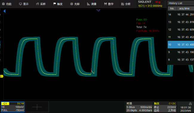 模板測(cè)試功能主要用于信號(hào)質(zhì)量的評(píng)估,能夠長(zhǎng)時(shí)間監(jiān)控波形的故障率,并根據(jù)故障波形定位原因。有兩種規(guī)則設(shè)置方式,一是通過(guò)在示波器中繪制多邊形模板創(chuàng)建規(guī)則,二是根據(jù)“完美波形”設(shè)置水平和垂直數(shù)值創(chuàng)建規(guī)則,而后示波器對(duì)波形進(jìn)行實(shí)時(shí)測(cè)試,可統(tǒng)計(jì)在規(guī)定的測(cè)試條件內(nèi)測(cè)試的次數(shù)、失敗的次數(shù)、失敗率等,還能夠設(shè)置“存儲(chǔ)失敗幀”,失敗波形可通過(guò)歷史模式進(jìn)行查看。
