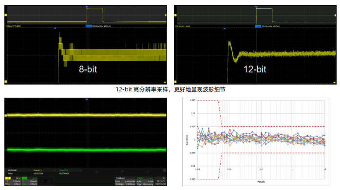 · 12-bit高分辨率ADC采樣,更好地呈現(xiàn)波形細(xì)節(jié)。相比于普通的8-bit示波器256級量化等級,12-bit示波器可達(dá)到4096級,是普通示波器的16倍,具備更小的量化誤差。
