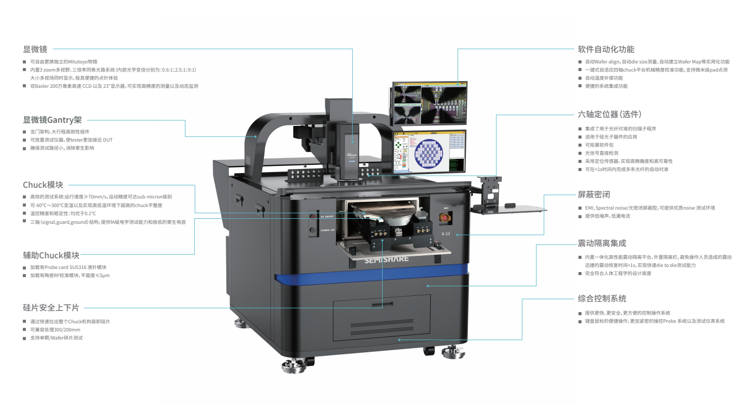 便捷的儀器接入同時(shí)支持系統(tǒng)全自動(dòng)擴(kuò)展升級(jí),溫控系統(tǒng)加載;另有多種測(cè)試模塊可選,根據(jù)測(cè)試模塊可搭載各種定位器、夾具和針卡與探針臺(tái)一起使用,如六軸定位器、RF線纜等;達(dá)行業(yè)最高水平的諸多系統(tǒng)運(yùn)行參數(shù)、功能和特點(diǎn),可滿足您不同的測(cè)試需求,同時(shí)也是更多行業(yè)客戶理想選擇的一款半自動(dòng)探針臺(tái)設(shè)備