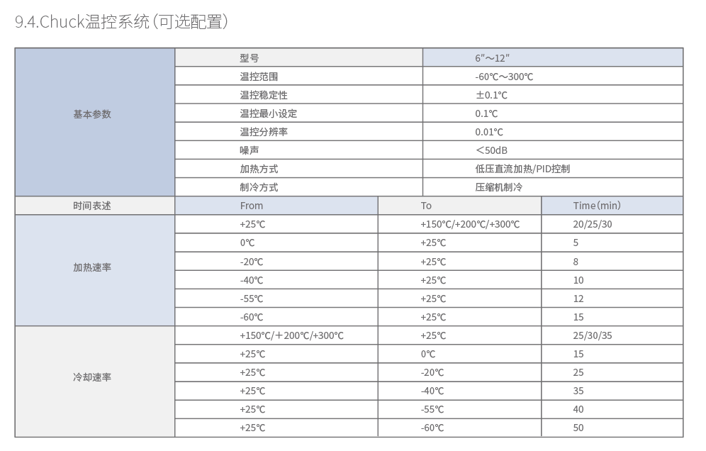 ● 高效的CHUCK測(cè)試系統(tǒng)運(yùn)行速度≥70mm/s,運(yùn)動(dòng)精度≤1μm,同時(shí)移動(dòng)轉(zhuǎn)位時(shí)間index time≤500ms,優(yōu)異的系統(tǒng)運(yùn)行參數(shù)已達(dá)到領(lǐng)先水平,高測(cè)試精度和效率滿足各類晶圓和器件的高重復(fù)性與穩(wěn)定性測(cè)試測(cè)試效率有效提升40%以上;●優(yōu)于± 0.08℃的溫控精度和穩(wěn)定性,提供高低溫環(huán)境下的可靠性晶圓測(cè)試;●四維運(yùn)動(dòng)低重心緊湊結(jié)構(gòu)設(shè)計(jì),確保70mm/s的運(yùn)動(dòng)速率的同時(shí)保持運(yùn)動(dòng)加減速的穩(wěn)定性。