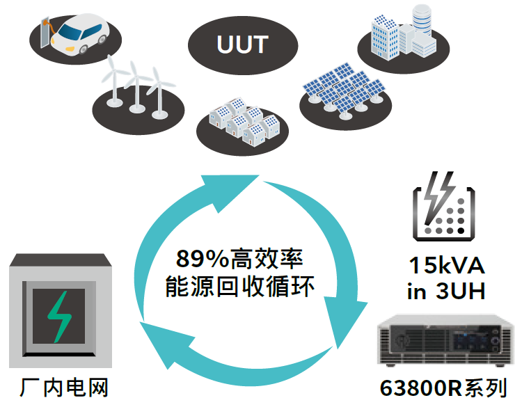 63800R系列可提供用戶完善的節(jié)能方案,透過其能源回收機(jī)制,被測物在拉載測試中所消耗的能量可高效率經(jīng)由機(jī)器回饋到電網(wǎng),而不是在測試過程以熱能消耗,達(dá)成環(huán)保節(jié)能的目的。借此,63800R系列可適用于市面上各項(xiàng)綠能相關(guān)產(chǎn)業(yè)測試,如儲能系統(tǒng)ESS、混合型太陽能逆變器(Hybrid PV Inverter)、電動(dòng)車交流充電設(shè)備(AC EVSE),以及雙向車載充電器(BOBC)的V2L、V2H應(yīng)用等。
