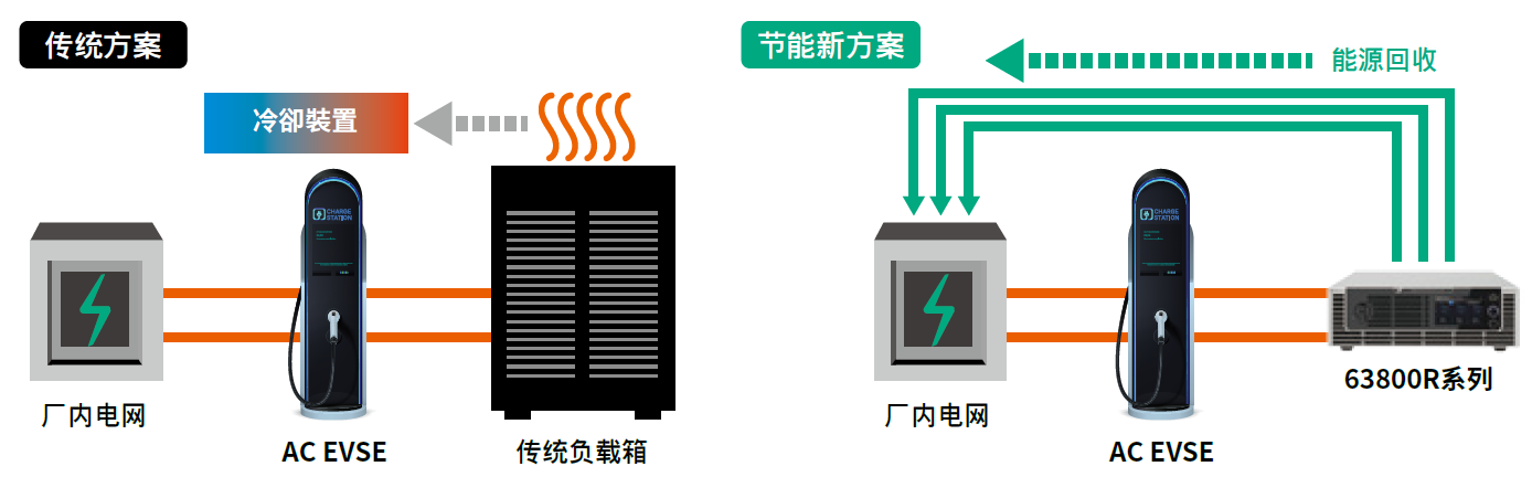 63800R系列能源回收式交流電子負(fù)載藉由高功率密度和高效率能源回收等特性,在測試領(lǐng)域提供交流電動(dòng)車充電樁(AC EVSE)全新的節(jié)能省碳方案。傳統(tǒng)使用的負(fù)載箱不僅體積龐大,更因?yàn)閷y試能量轉(zhuǎn)為熱能,造成大量能源耗費(fèi),同時(shí)須配置對應(yīng)的置冷系統(tǒng)來避免環(huán)境過熱,而Chroma 63800R系列具備最高89%效率之能源回收功能,以使用滿功率拉載為例,一臺設(shè)備每年可替產(chǎn)線節(jié)省116,946kWh的電力,相當(dāng)於45,258kg的碳排放量,除了達(dá)到節(jié)能目的之外,亦可大幅縮減置冷成本,且3U高機(jī)身對比龐大笨重的負(fù)載箱,可帶來更彈性的測試配置。此外,Chroma 63800R系列配備完整的CC、CP、CR拉載模式,符合AC EVSE的CCID/RCD漏電流要求標(biāo)準(zhǔn),可提供更經(jīng)濟(jì)且可靠的老化測試、拉載特性測試之解決方案。
